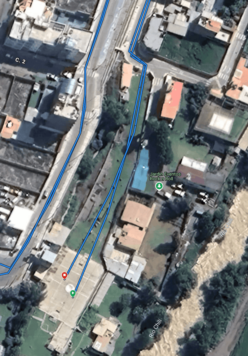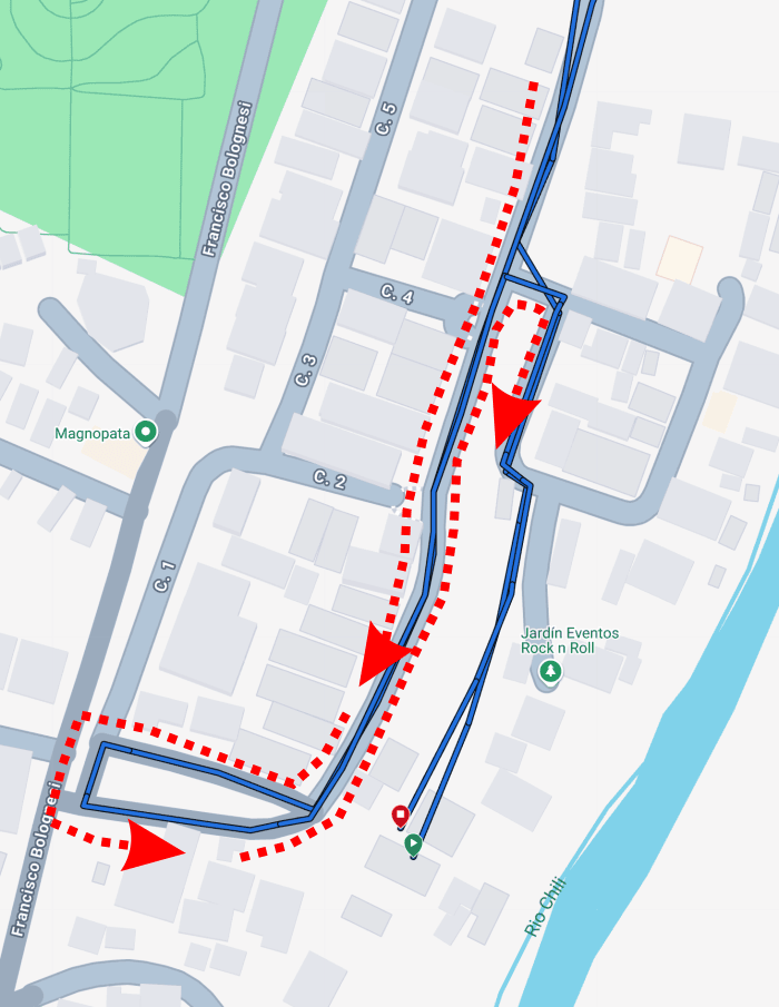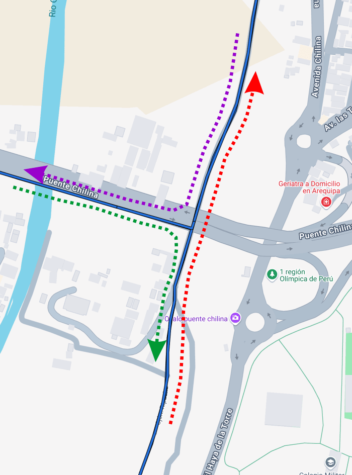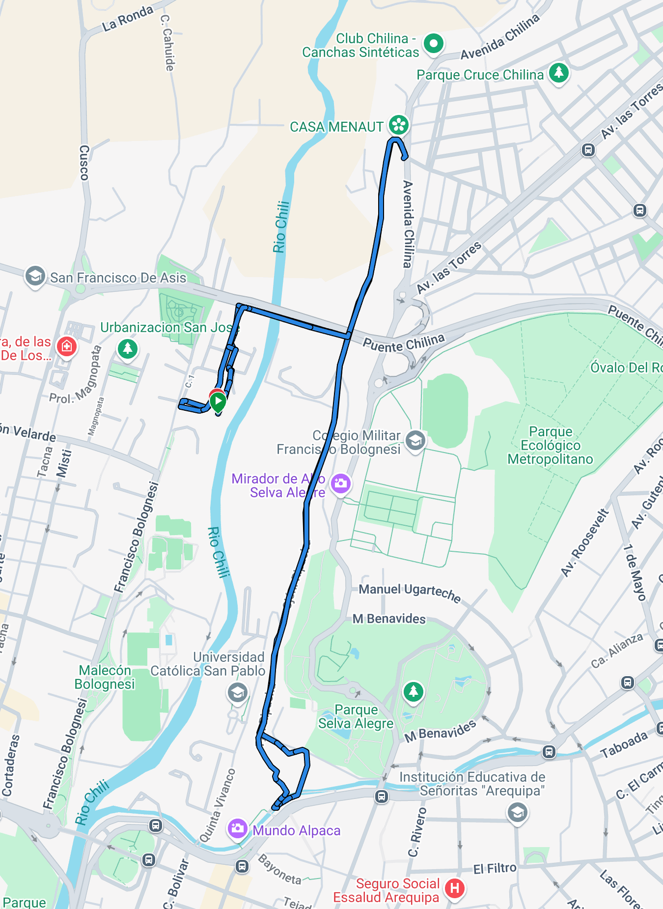 Pasando EGASA volteamos a la derecha (línea verde), a la vuelta subimos (línea roja) hasta el cruce con la avenida Chilina y volvemos a cruzar por EGASA de regreso (línea morada)